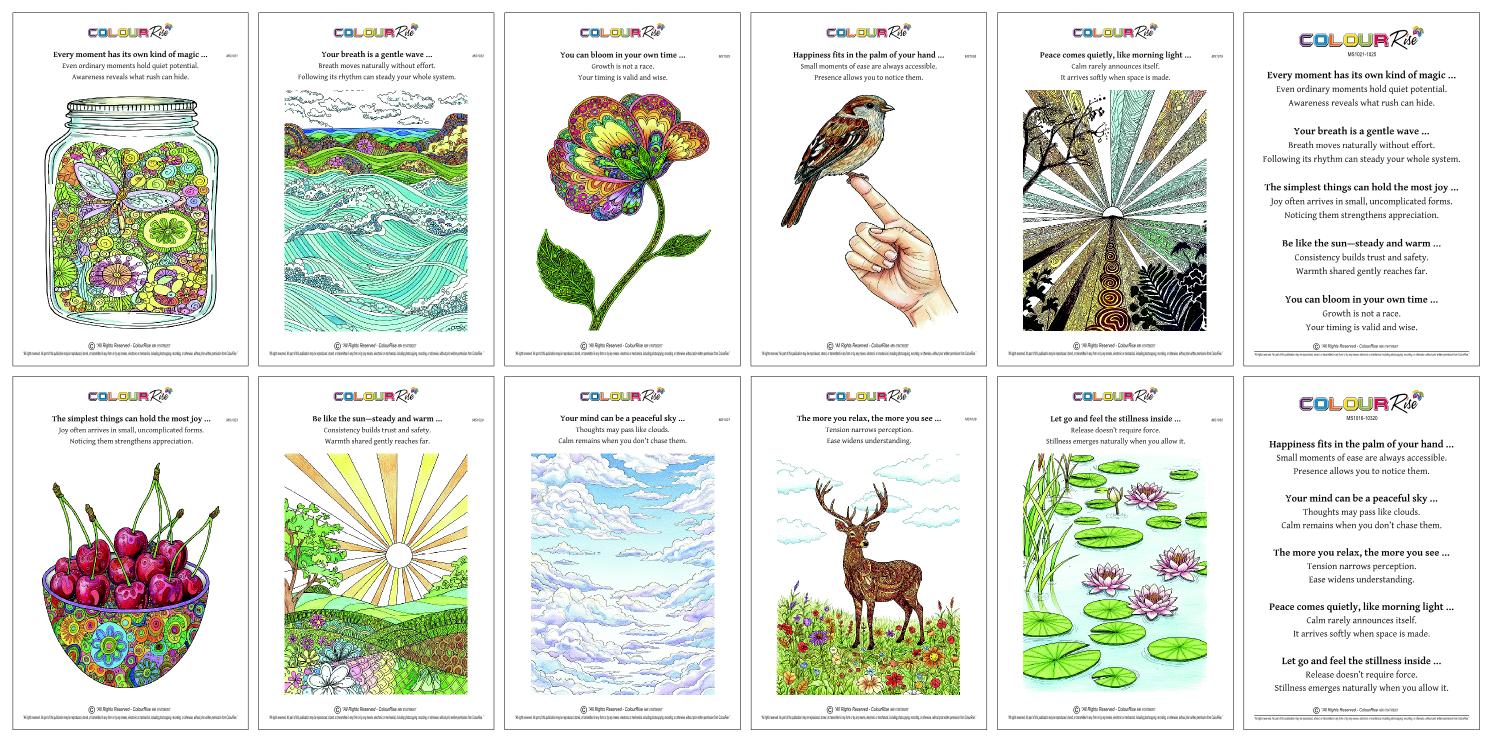 Each beautifully curated pack is designed to create a calm, reflective space where your mind can slow down and drift into pleasant, peaceful thoughts. With thoughtfully selected images and uplifting quotes, ColourRise invites you to take a quiet moment just for yourself - no pressure, no performance, just simple presence.